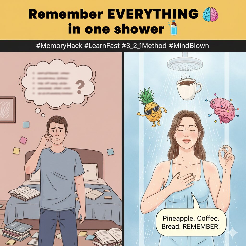 7-second viral reveal: show someone forgetting a list, then applying the 3-2-1 shower trick and reciting it perfectly — viewers immediately want to try.