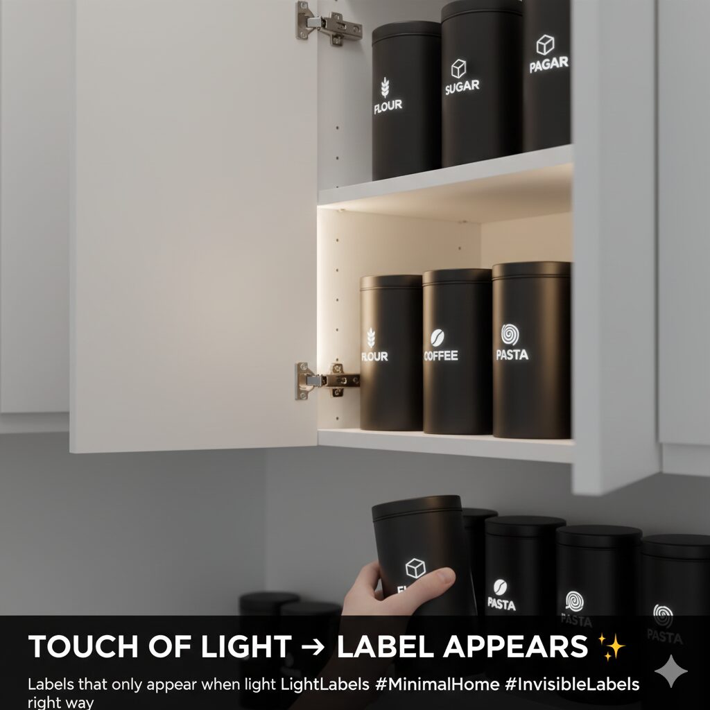 Why it’s mind-blowing: labels are invisible until the cabinet/door opens — the angle of incoming light activates a micro-louver sheet that casts a crisp icon/word on a hidden matte panel. It’s like the shelf answers you with a built-in readout — no electronics, no heat.