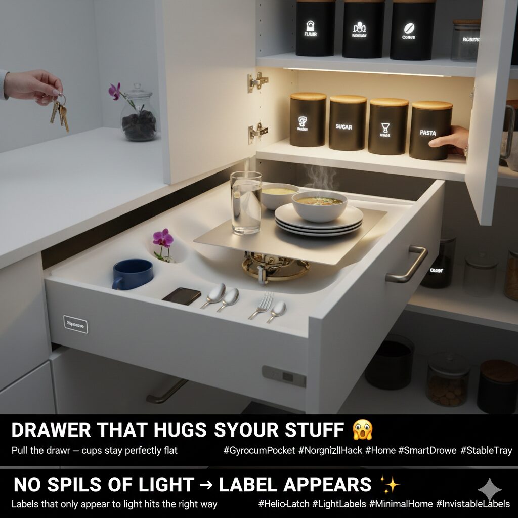 Why it’s mind-blowing: a tiny passive gimbal built into a drawer or shelf keeps the surface level while the drawer moves, so liquids don’t slosh and stacked items never tip — cinematic, oddly satisfying, and super practical.