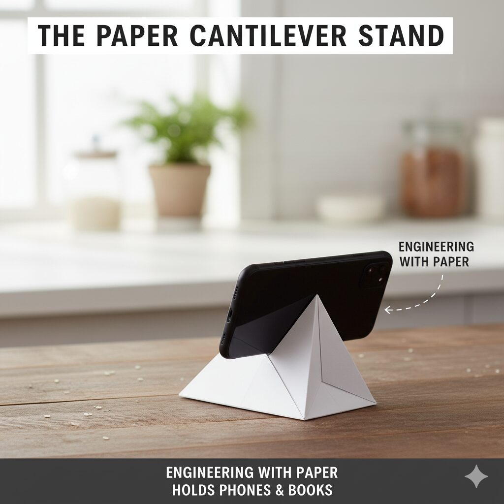 This hack uses pure engineering. A single sheet of printer paper, folded into a triangular cantilever shape, becomes strong enough to hold a smartphone or even a thick book.