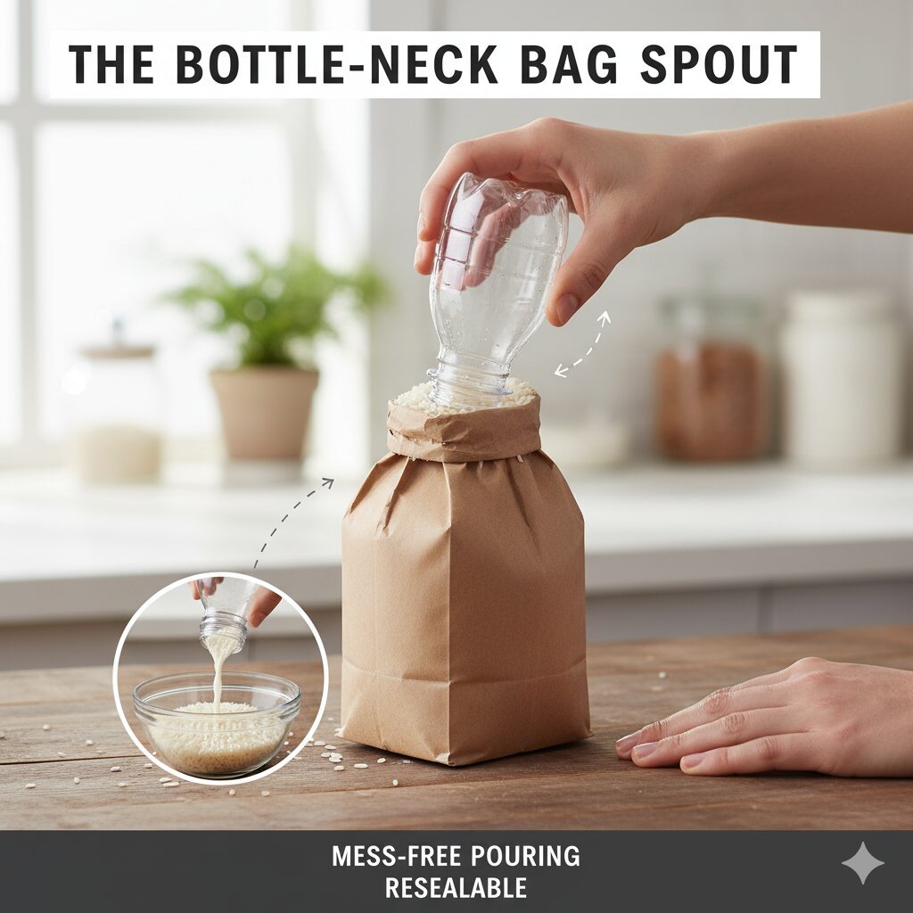 Messy rice bags? Torn flour pouches? Powder spilling everywhere? This hack instantly transforms any soft bag into a perfect screw-cap container — using only the top of a plastic bottle.