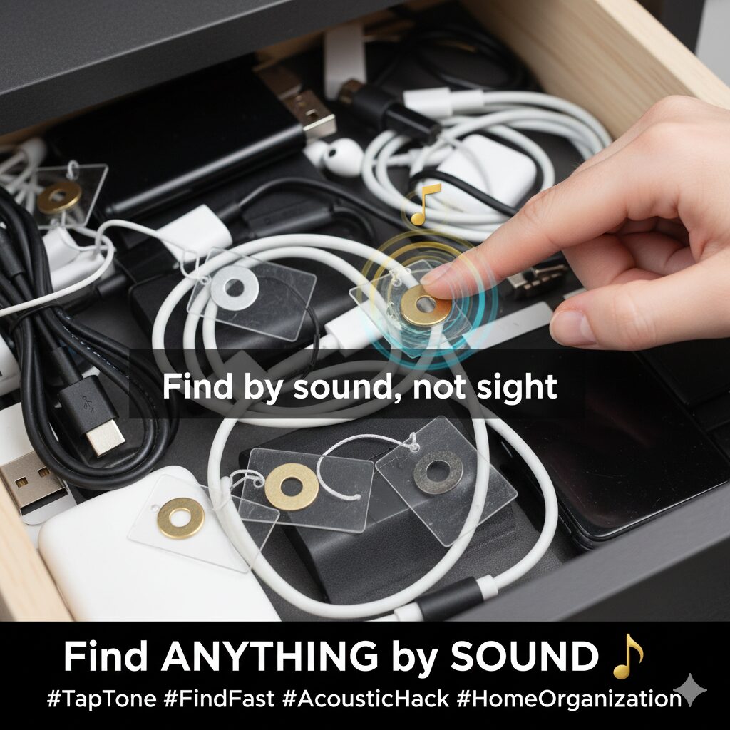 How to demo (7-second reveal): messy drawer → you tap each tag quickly → friendly jingle of distinct notes → you point to correct charger instantly — overlay: “Find by sound, not sight.”