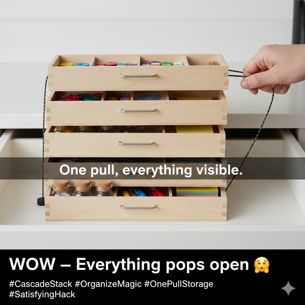 Hashtags: #CascadeStack #OrganizeMagic #OnePullStorage #SatisfyingHack