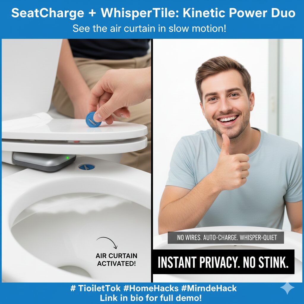 Why it’s mind-blowing: it converts the single most natural mechanical event — sitting down — into a privacy/odor defense system. People will call it toilet tech that works without plugging in anything. It’s also a sleek gadget idea for modern bathrooms.
