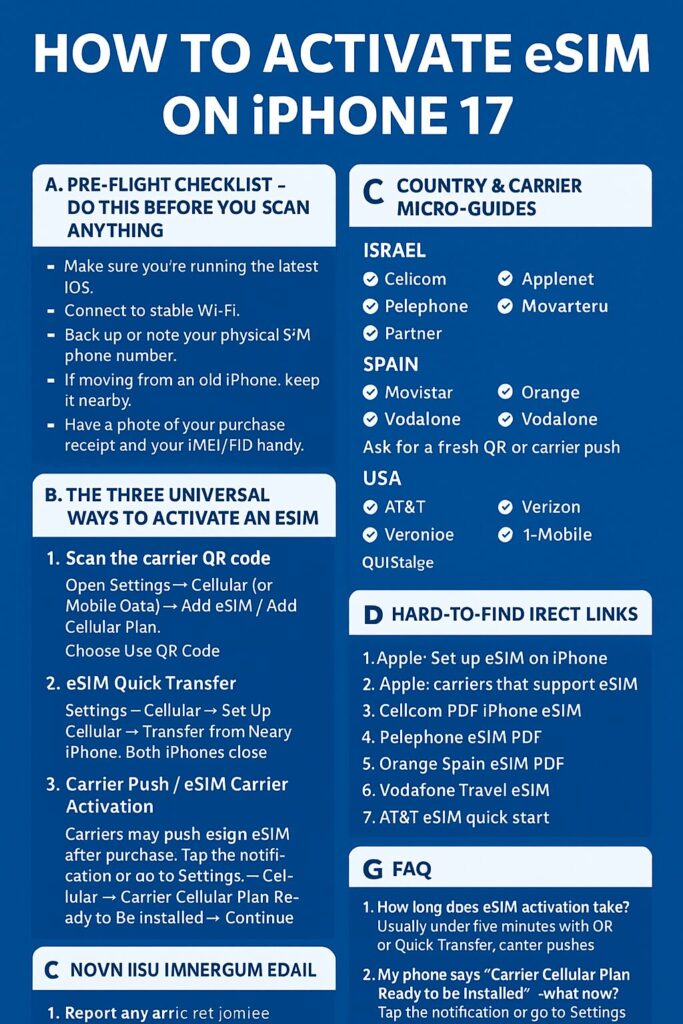 If you just bought (or preordered) an iPhone 17 and it’s eSIM-first in your country, follow these steps: 1) Preflight checklist, 2) Quick activation (QR / Quick Transfer / Carrier Push), 3) Troubleshooting & sample messages to send to support. This post also includes rare direct links (carrier PDFs & activation pages) that you won’t easily find in search. Apple’s official activation methods are the backbone here.