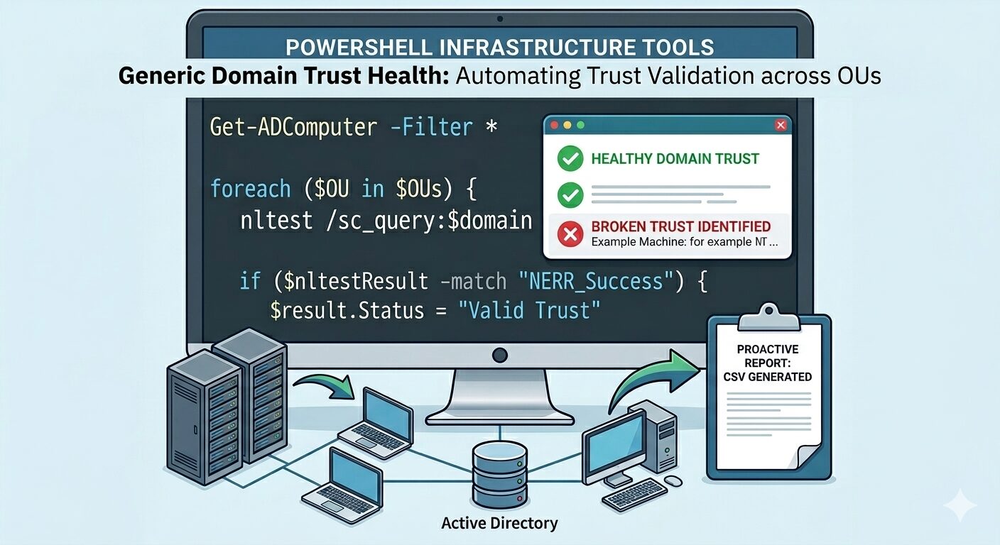 Today, I’m sharing a two-stage PowerShell automation framework I developed to proactively validate Active Directory trust relationships across specific Organizational Units (OUs).