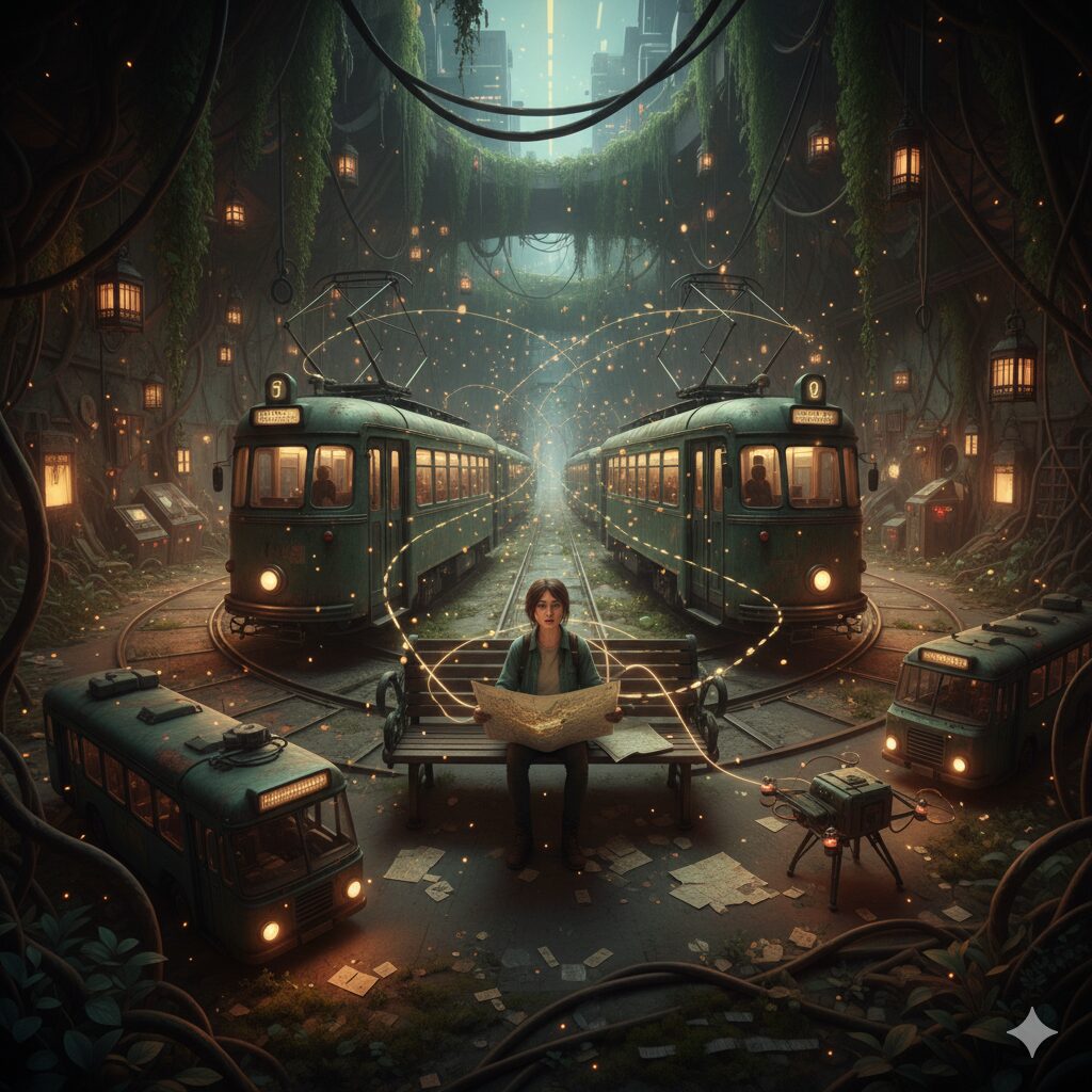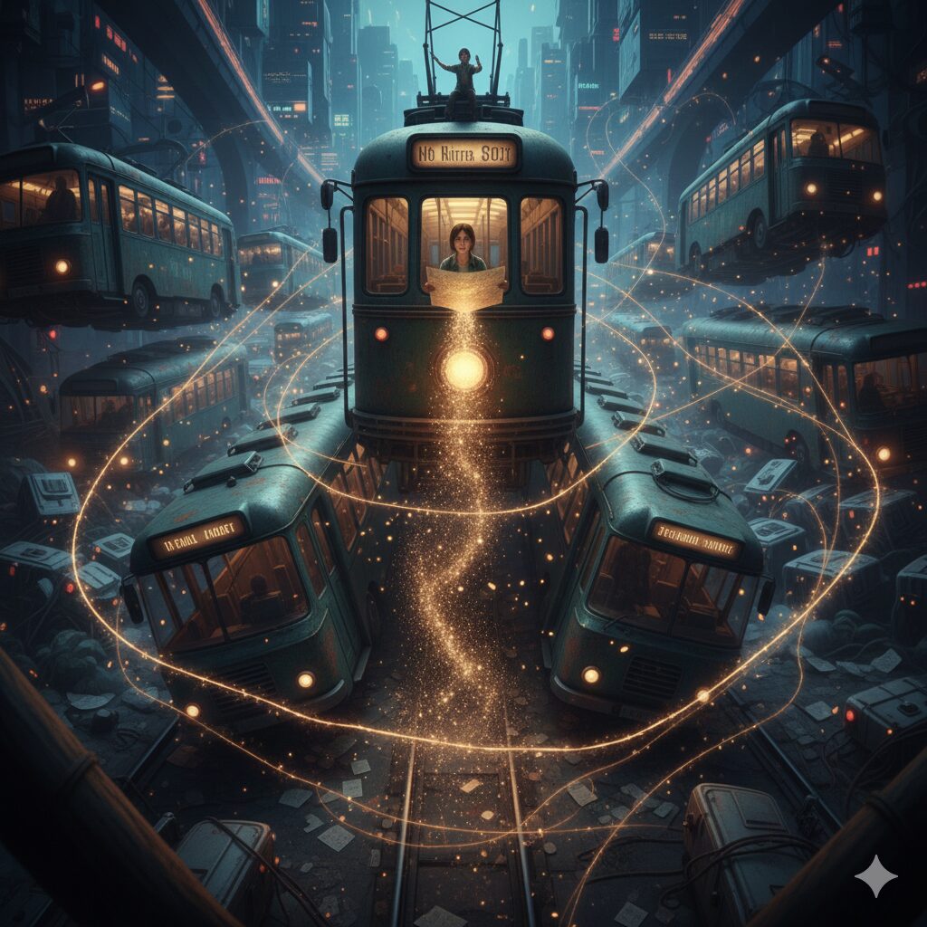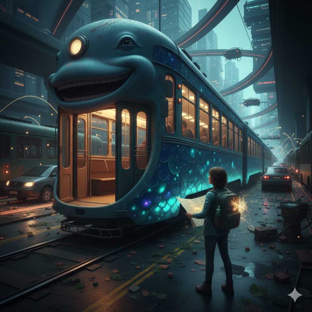 “Ah,” said the tram. The voice was the low ring of rails, the creak of suspension. “You’re new. Are you a passenger or a problem?”